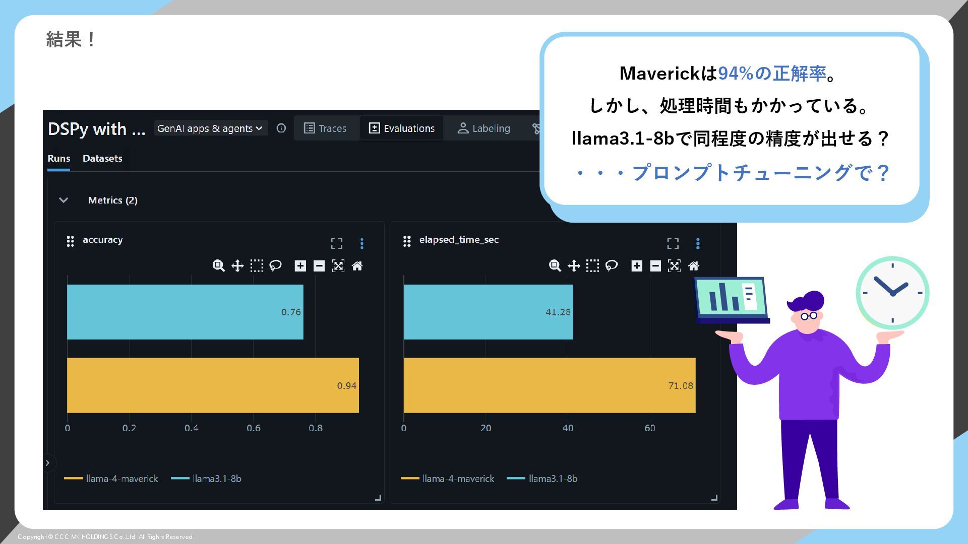 © CCC MK HOLDINGS Co.,Ltd. All Rights Reserved. 結果! v Maverickは94%の正解率。 しかし、処理時間もかかっている。 llama3.1-8bで同程度の精度が出せる? ・・・プロンプトチューニングで?