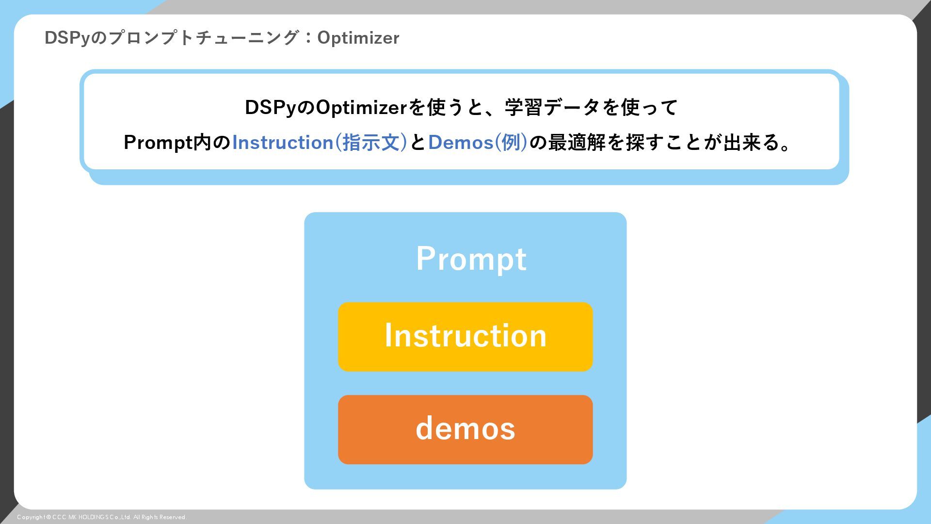 © CCC MK HOLDINGS Co.,Ltd. All Rights Reserved. DSPyのプロンプトチューニング:Optimizer v DSPyのOptimizerを使うと、学習データを使って Prompt内のInstruction(指示文)とDemos(例)の最適解を探すことが出来る。 Prompt Instruction demos