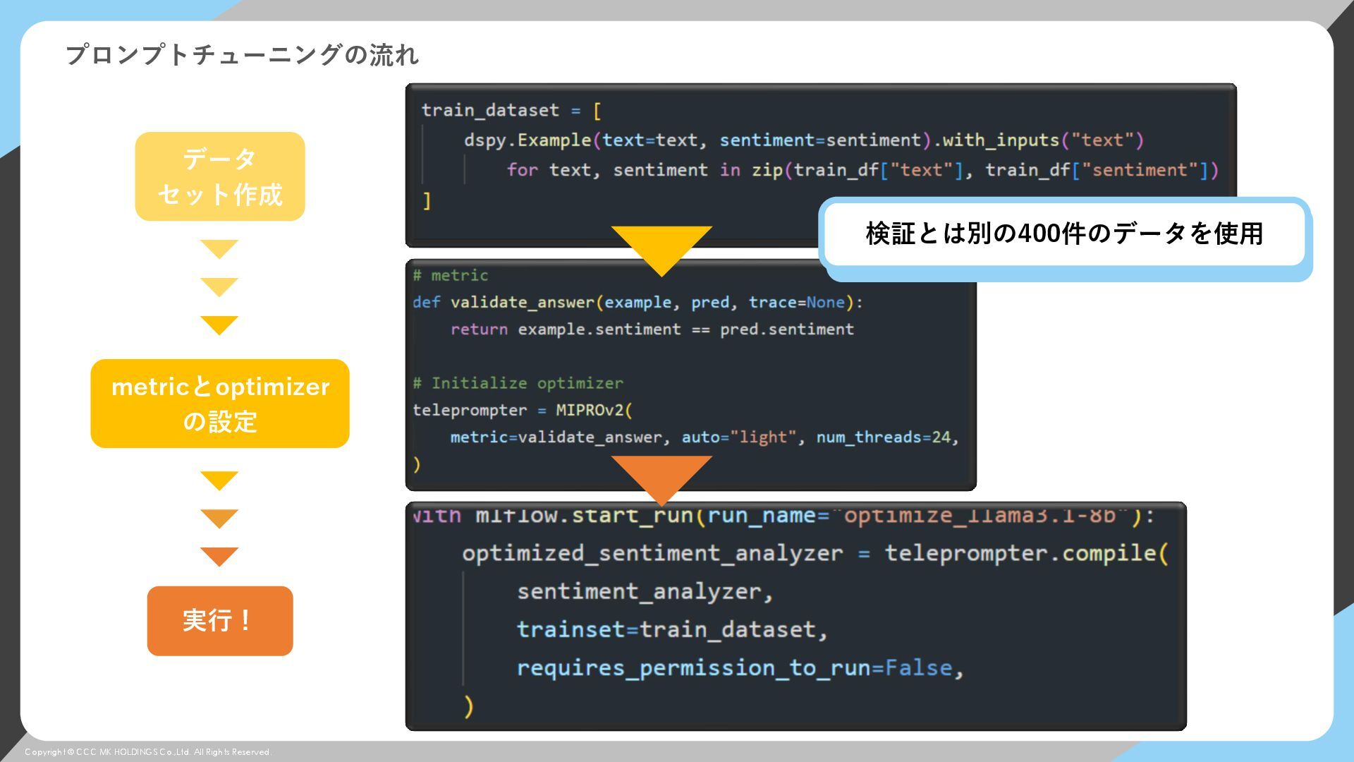 © CCC MK HOLDINGS Co.,Ltd. All Rights Reserved. プロンプトチューニングの流れ データ セット作成 metricとoptimizer の設定 実行! v 検証とは別の400件のデータを使用