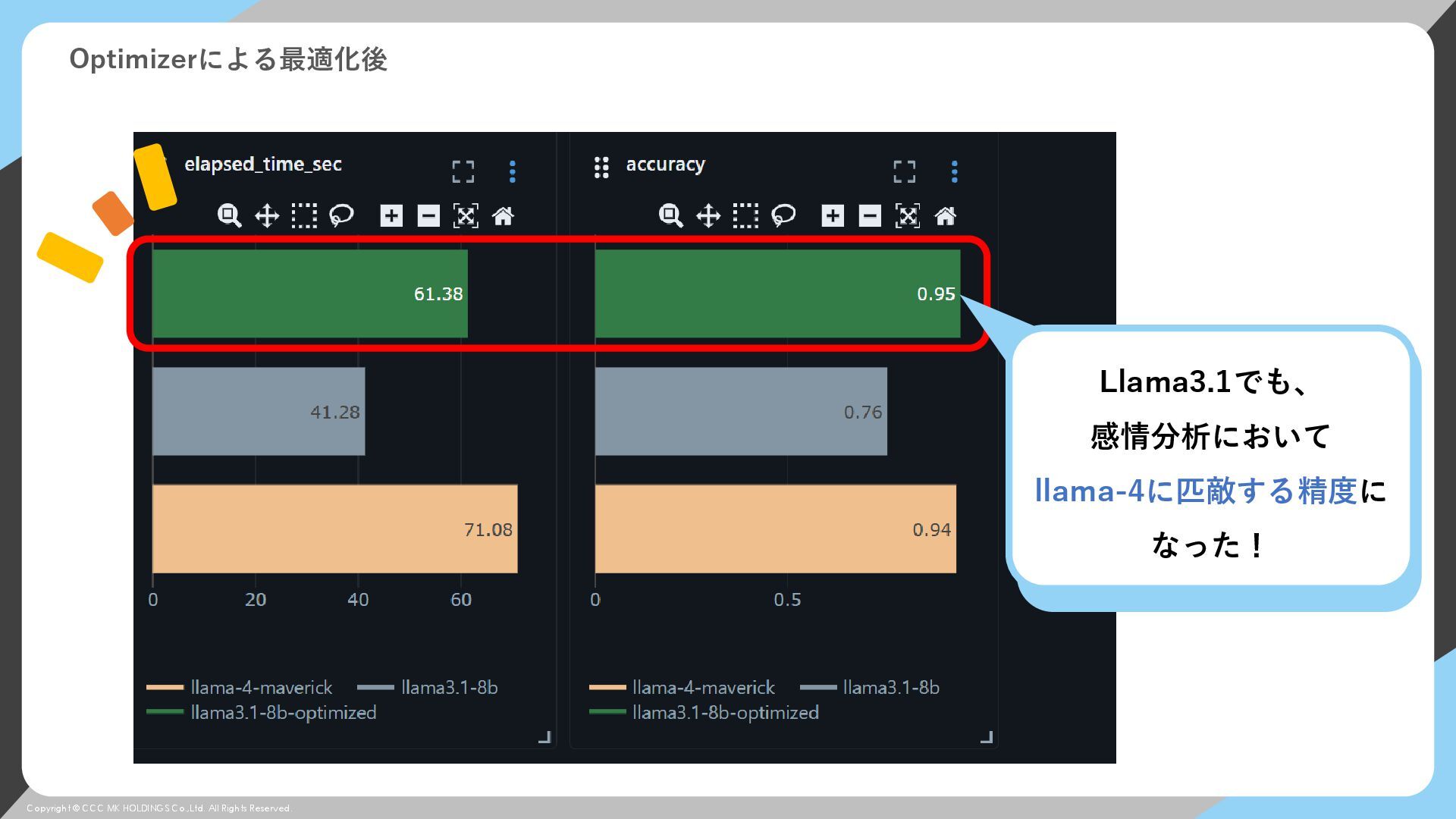 © CCC MK HOLDINGS Co.,Ltd. All Rights Reserved. Optimizerによる最適化後 v Llama3.1でも、 感情分析において llama-4に匹敵する精度に なった!