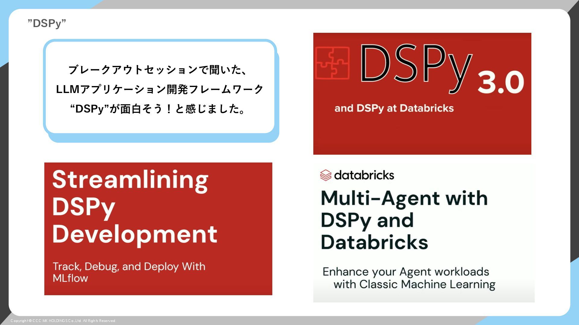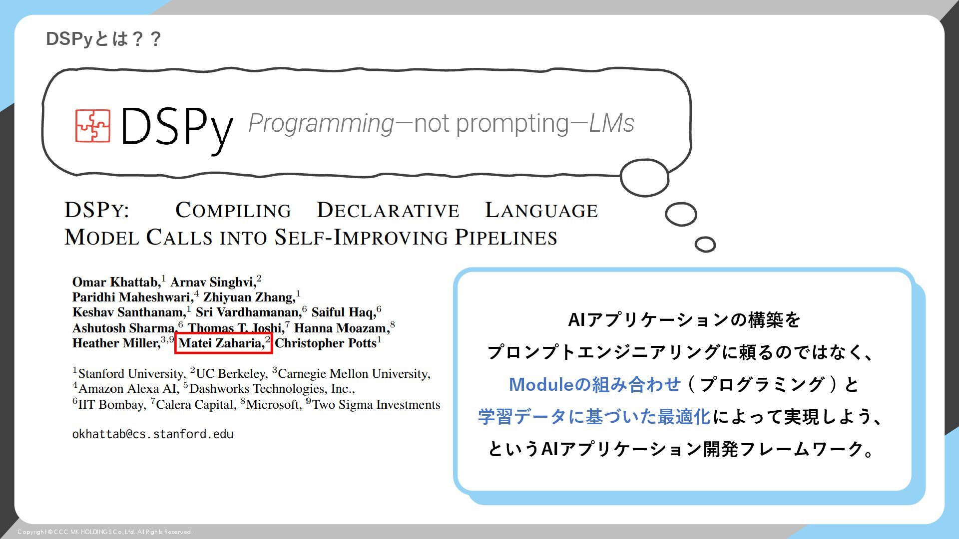 © CCC MK HOLDINGS Co.,Ltd. All Rights Reserved. ”DSPy” v ブレークアウトセッションで聞いた、 LLMアプリケーション開発フレームワーク “DSPy”が面白そう!と感じました。