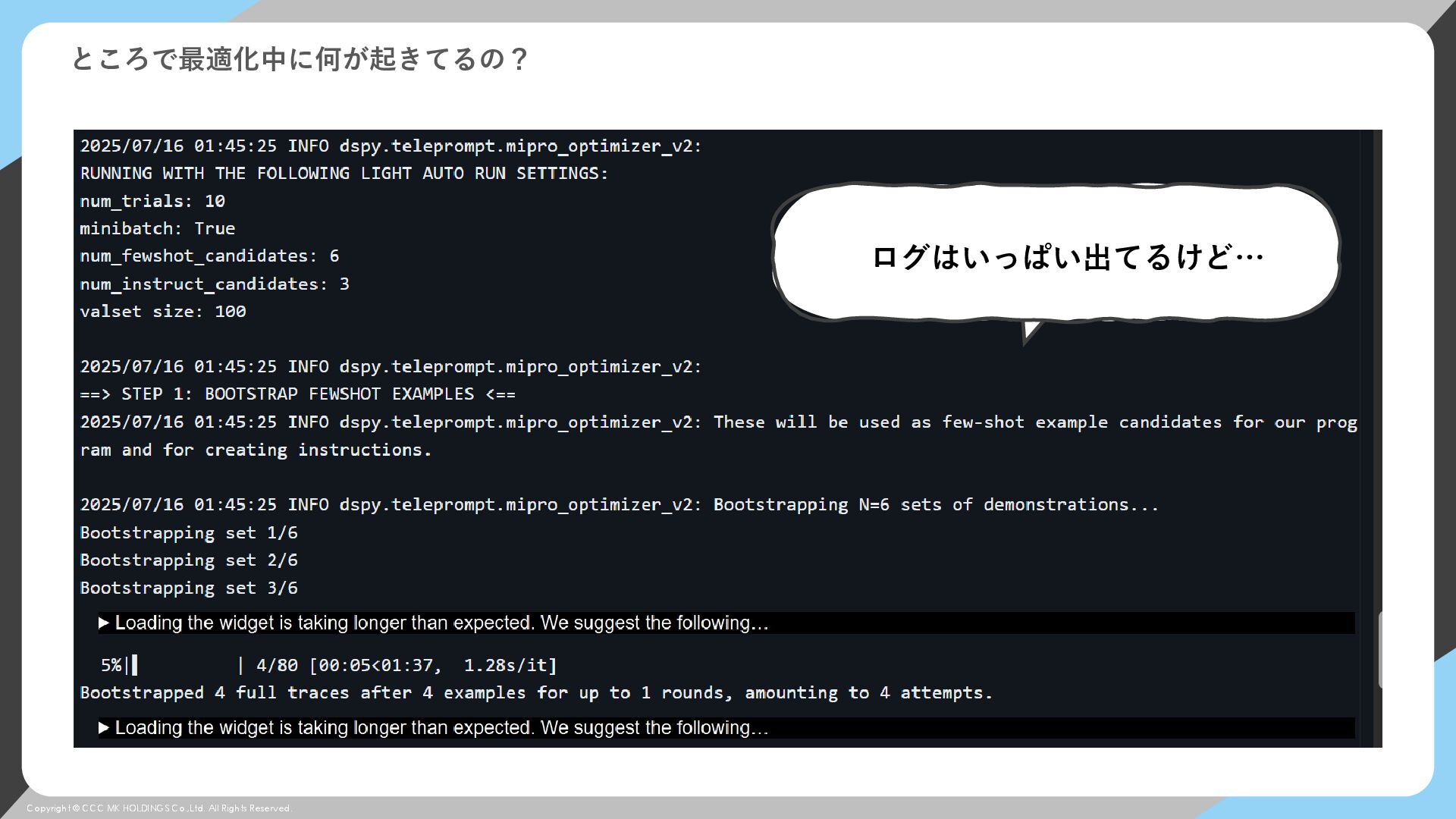 © CCC MK HOLDINGS Co.,Ltd. All Rights Reserved. ところで最適化中に何が起きてるの? ログはいっぱい出てるけど…
