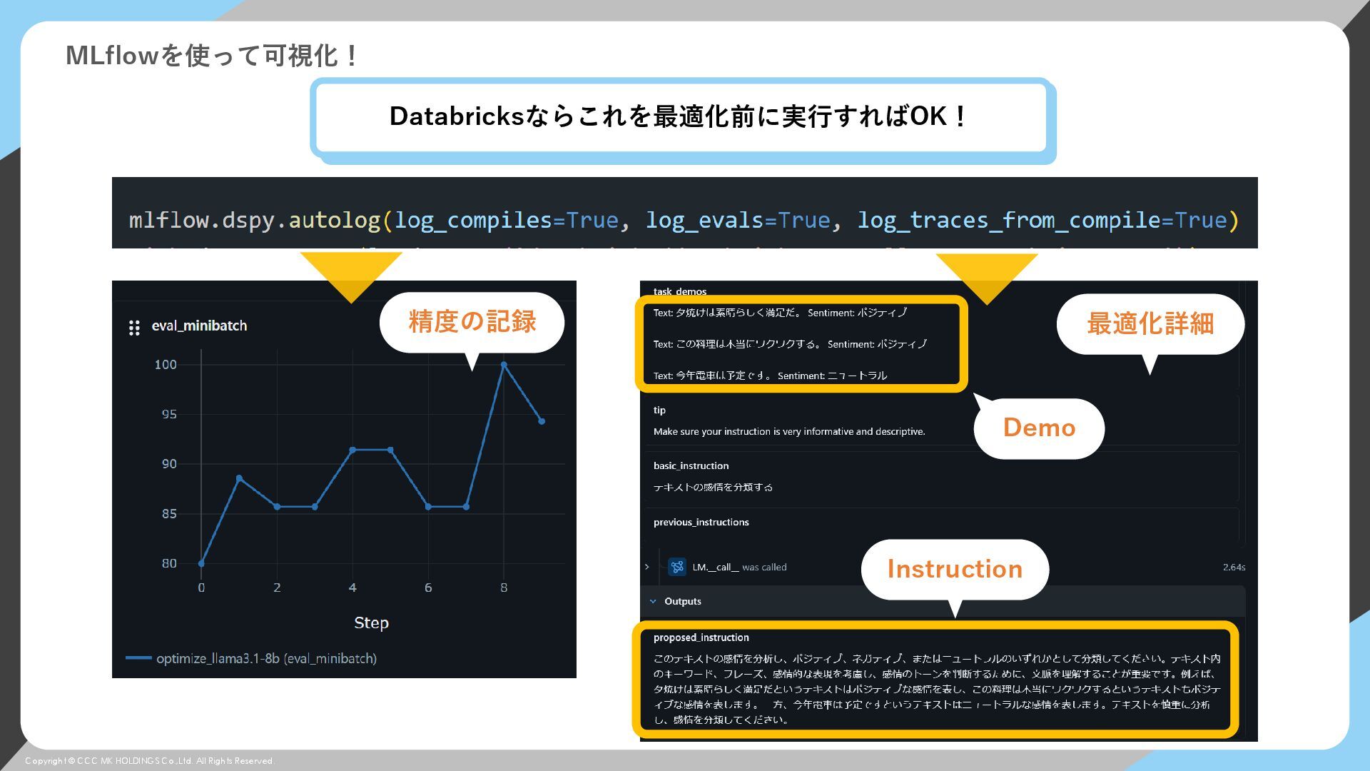 © CCC MK HOLDINGS Co.,Ltd. All Rights Reserved. MLflowを使って可視化! v Databricksならこれを最適化前に実行すればOK! 精度の記録 Demo 最適化詳細 Instruction