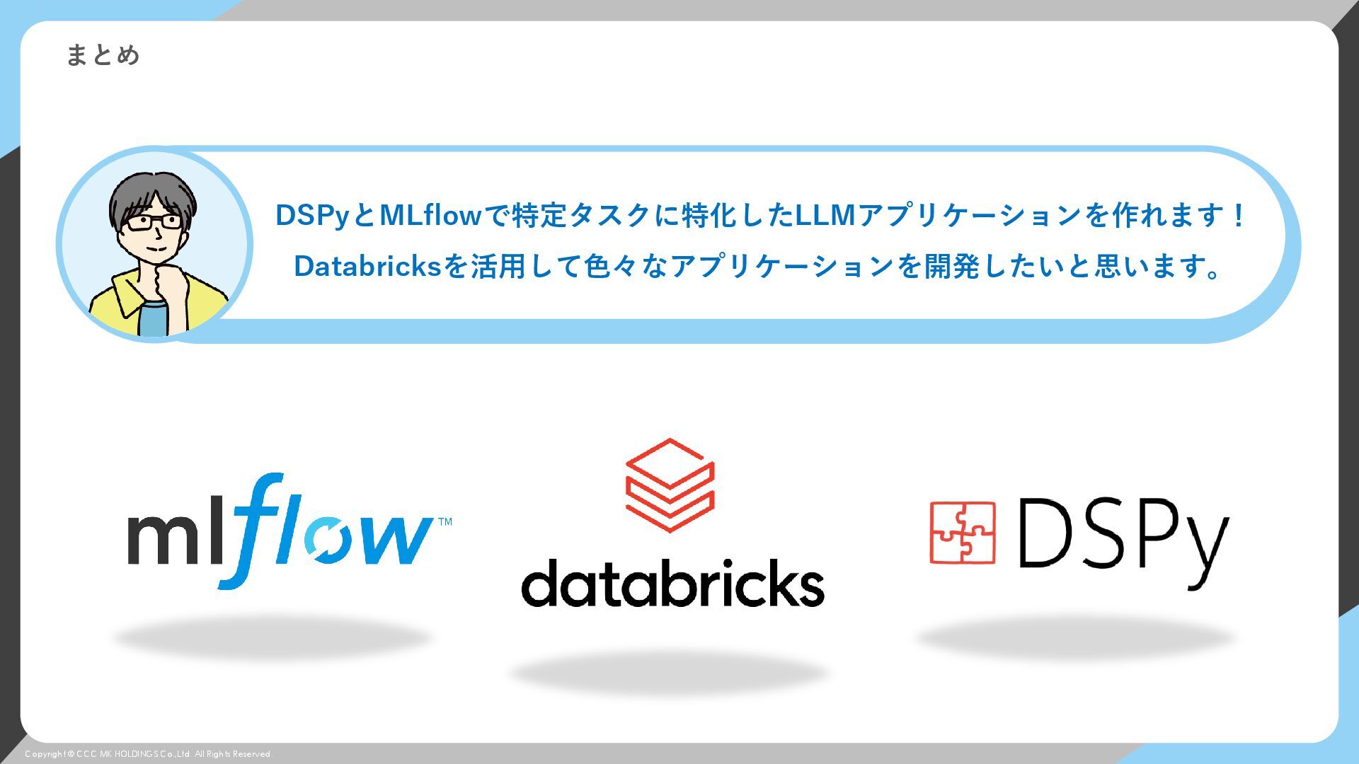 © CCC MK HOLDINGS Co.,Ltd. All Rights Reserved. まとめ v DSPyとMLflowで特定タスクに特化したLLMアプリケーションを作れます! Databricksを活用して色々なアプリケーションを開発したいと思います。