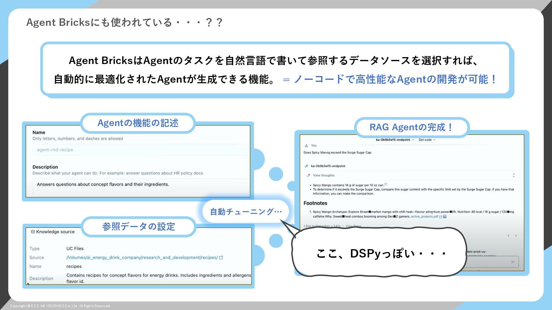 © CCC MK HOLDINGS Co.,Ltd. All Rights Reserved. v v Agent Bricksにも使われている・・・?? Agent BricksはAgentのタスクを自然言語で書いて参照するデータソースを選択すれば、 自動的に最適化されたAgentが生成できる機能。 = ノーコードで高性能なAgentの開発が可能! Agentの機能の記述 参照データの設定 RAG Agentの完成! 自動チューニング… ここ、DSPyっぽい・・・