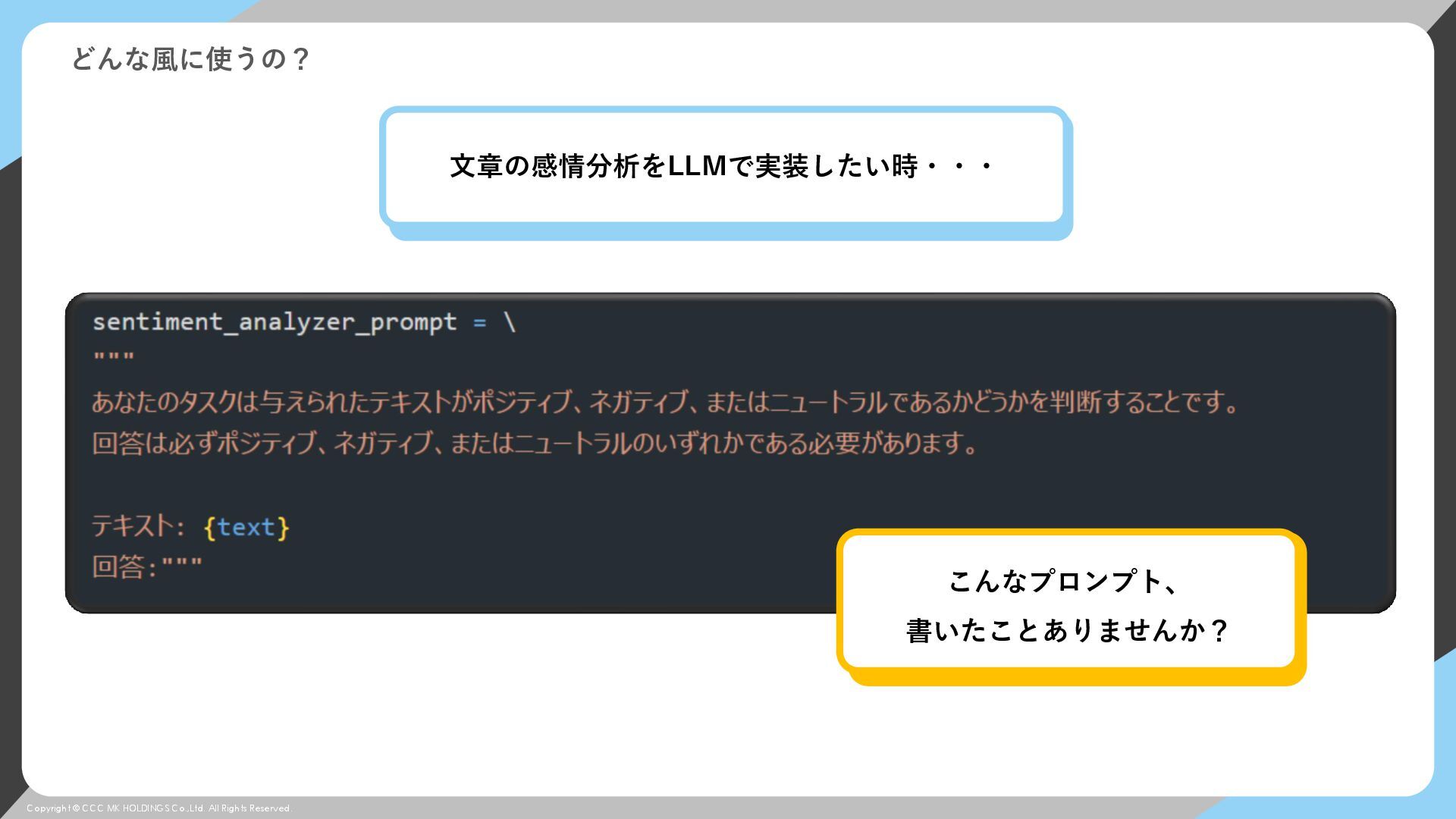 © CCC MK HOLDINGS Co.,Ltd. All Rights Reserved. どんな風に使うの? v 文章の感情分析をLLMで実装したい時・・・ v こんなプロンプト、 書いたことありませんか?
