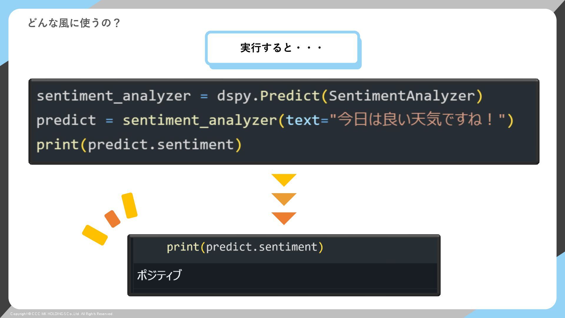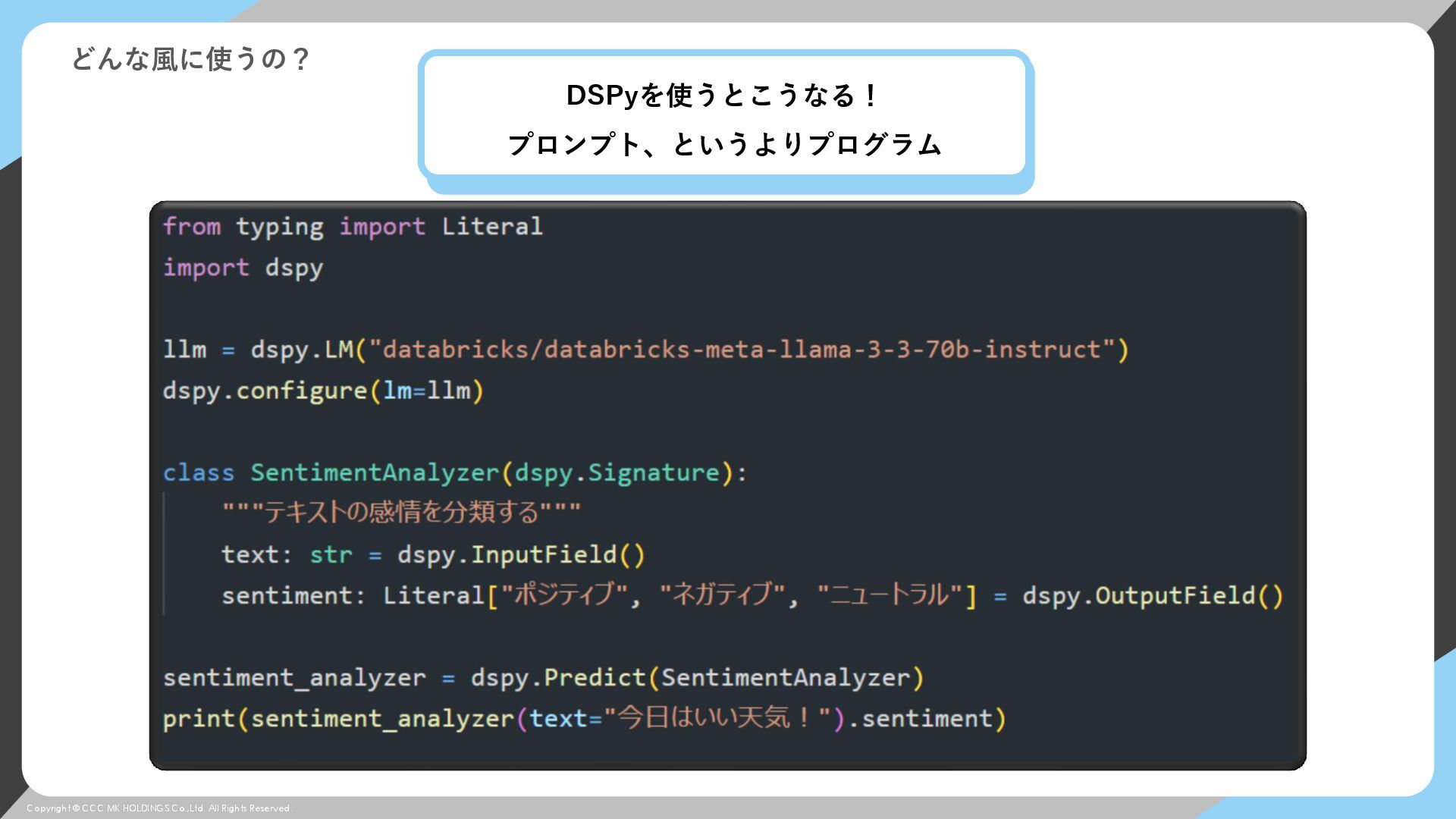 © CCC MK HOLDINGS Co.,Ltd. All Rights Reserved. どんな風に使うの? v DSPyを使うとこうなる! プロンプト、というよりプログラム