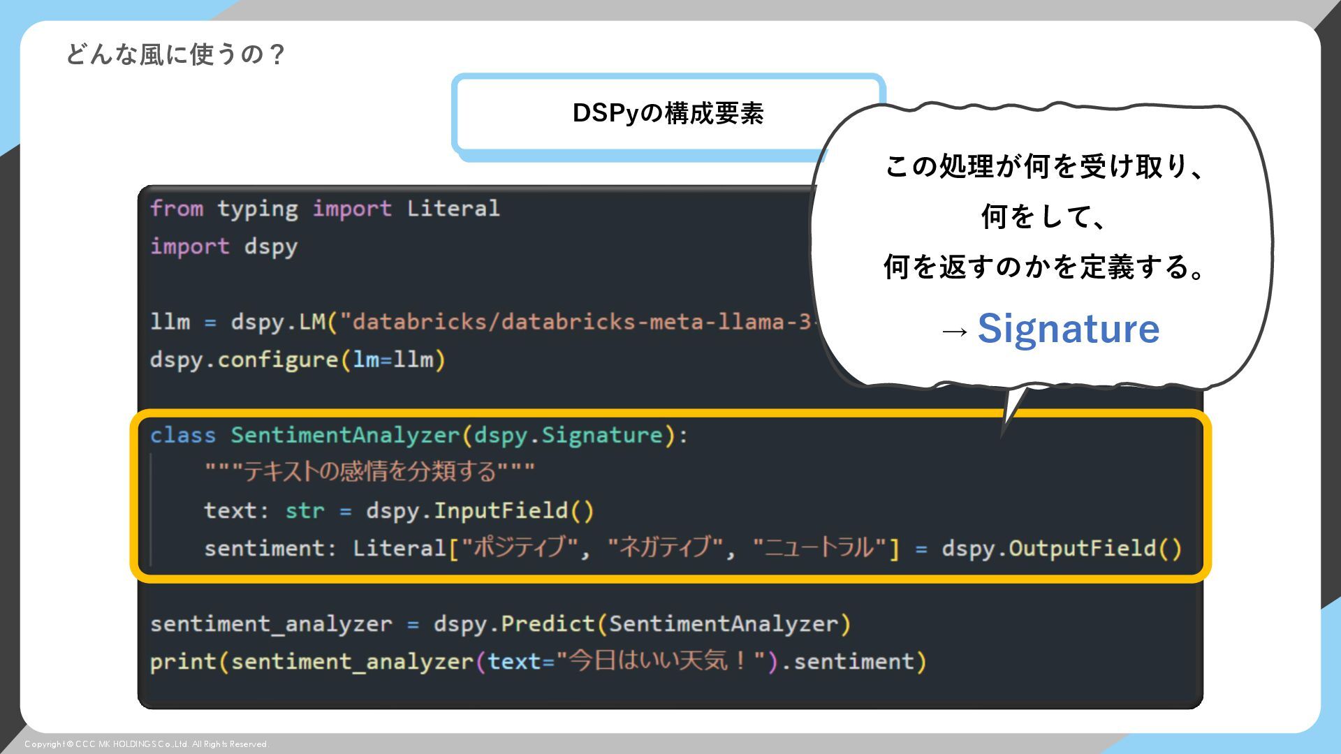 © CCC MK HOLDINGS Co.,Ltd. All Rights Reserved. どんな風に使うの? v DSPyの構成要素 この処理が何を受け取り、 何をして、 何を返すのかを定義する。 → Signature