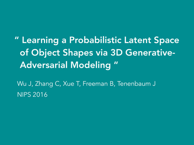 Wu, Jiajun, et al. "Learning a probabilistic latent space of object shapes via 3d generative-adversarial modeling." Advances in Neural Information Processing Systems. 2016.