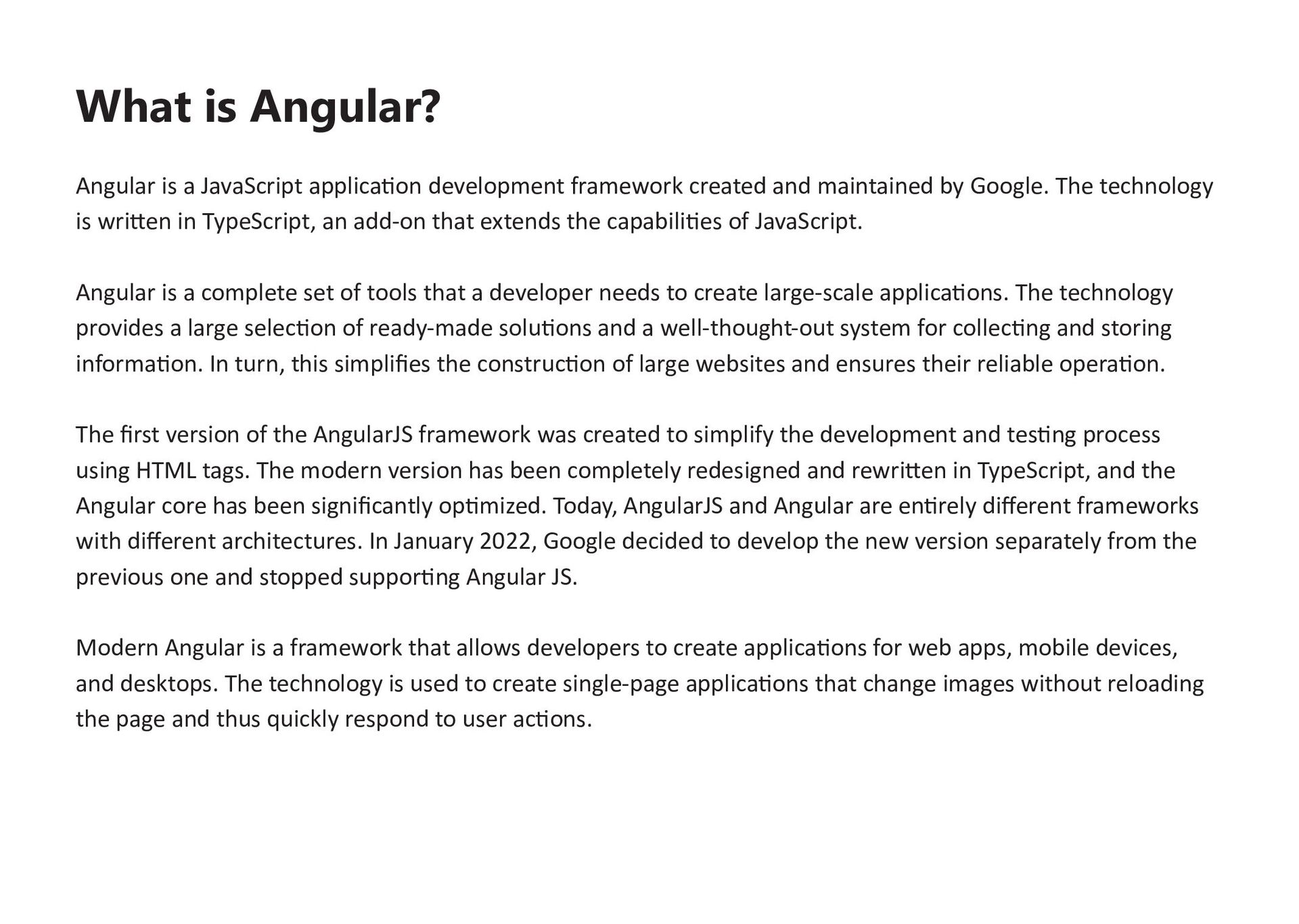 created and maintained by Google. The technology is wri�en in TypeScript, an add-on that extends the capabili�es of JavaScript. Angular is a complete set of tools that a developer needs to create large-scale applica�ons. The technology provides a large selec�on of ready-made solu�ons and a well-thought-out system for collec�ng and storing informa�on. In turn, this simplifies the construc�on of large websites and ensures their reliable opera�on. The first version of the AngularJS framework was created to simplify the development and tes�ng process using HTML tags. The modern version has been completely redesigned and rewri�en in TypeScript, and the Angular core has been significantly op�mized. Today, AngularJS and Angular are en�rely different frameworks with different architectures. In January 2022, Google decided to develop the new version separately from the previous one and stopped suppor�ng Angular JS. Modern Angular is a framework that allows developers to create applica�ons for web apps, mobile devices, and desktops. The technology is used to create single-page applica�ons that change images without reloading the page and thus quickly respond to user ac�ons.