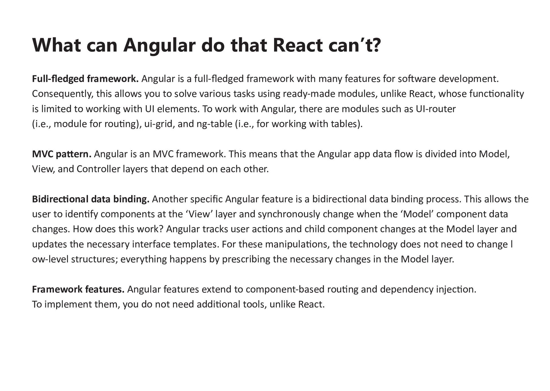 is a full-fledged framework with many features for so�ware development. Consequently, this allows you to solve various tasks using ready-made modules, unlike React, whose func�onality is limited to working with UI elements. To work with Angular, there are modules such as UI-router (i.e., module for rou�ng), ui-grid, and ng-table (i.e., for working with tables). MVC pa�ern. Angular is an MVC framework. This means that the Angular app data flow is divided into Model, View, and Controller layers that depend on each other. Bidirec�onal data binding. Another specific Angular feature is a bidirec�onal data binding process. This allows the user to iden�fy components at the ‘View’ layer and synchronously change when the ‘Model’ component data changes. How does this work? Angular tracks user ac�ons and child component changes at the Model layer and updates the necessary interface templates. For these manipula�ons, the technology does not need to change l ow-level structures; everything happens by prescribing the necessary changes in the Model layer. Framework features. Angular features extend to component-based rou�ng and dependency injec�on. To implement them, you do not need addi�onal tools, unlike React.
