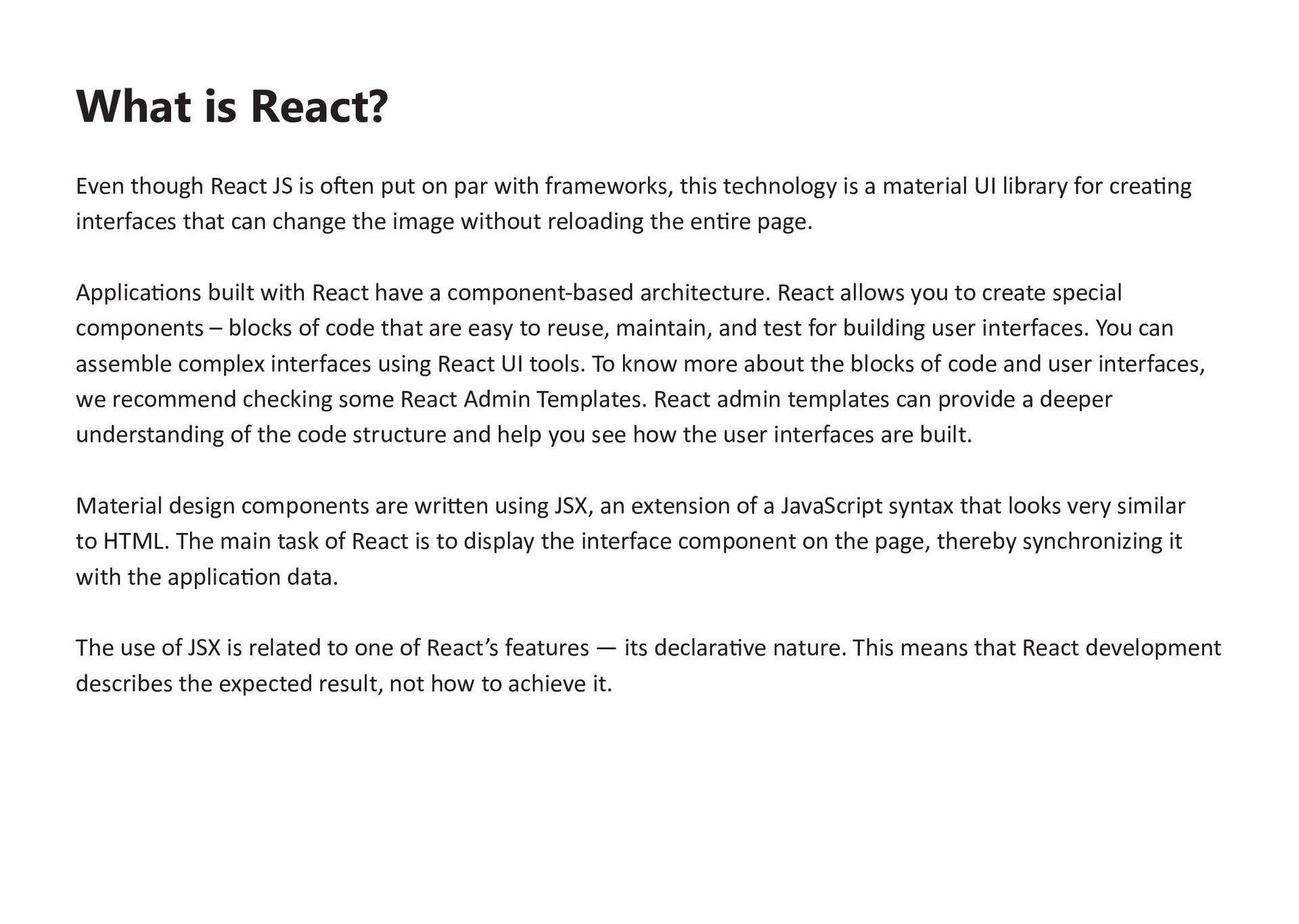 on par with frameworks, this technology is a material UI library for crea�ng interfaces that can change the image without reloading the en�re page. Applica�ons built with React have a component-based architecture. React allows you to create special components – blocks of code that are easy to reuse, maintain, and test for building user interfaces. You can assemble complex interfaces using React UI tools. To know more about the blocks of code and user interfaces, we recommend checking some React Admin Templates. React admin templates can provide a deeper understanding of the code structure and help you see how the user interfaces are built. Material design components are wri�en using JSX, an extension of a JavaScript syntax that looks very similar to HTML. The main task of React is to display the interface component on the page, thereby synchronizing it with the applica�on data. The use of JSX is related to one of React’s features — its declara�ve nature. This means that React development describes the expected result, not how to achieve it.