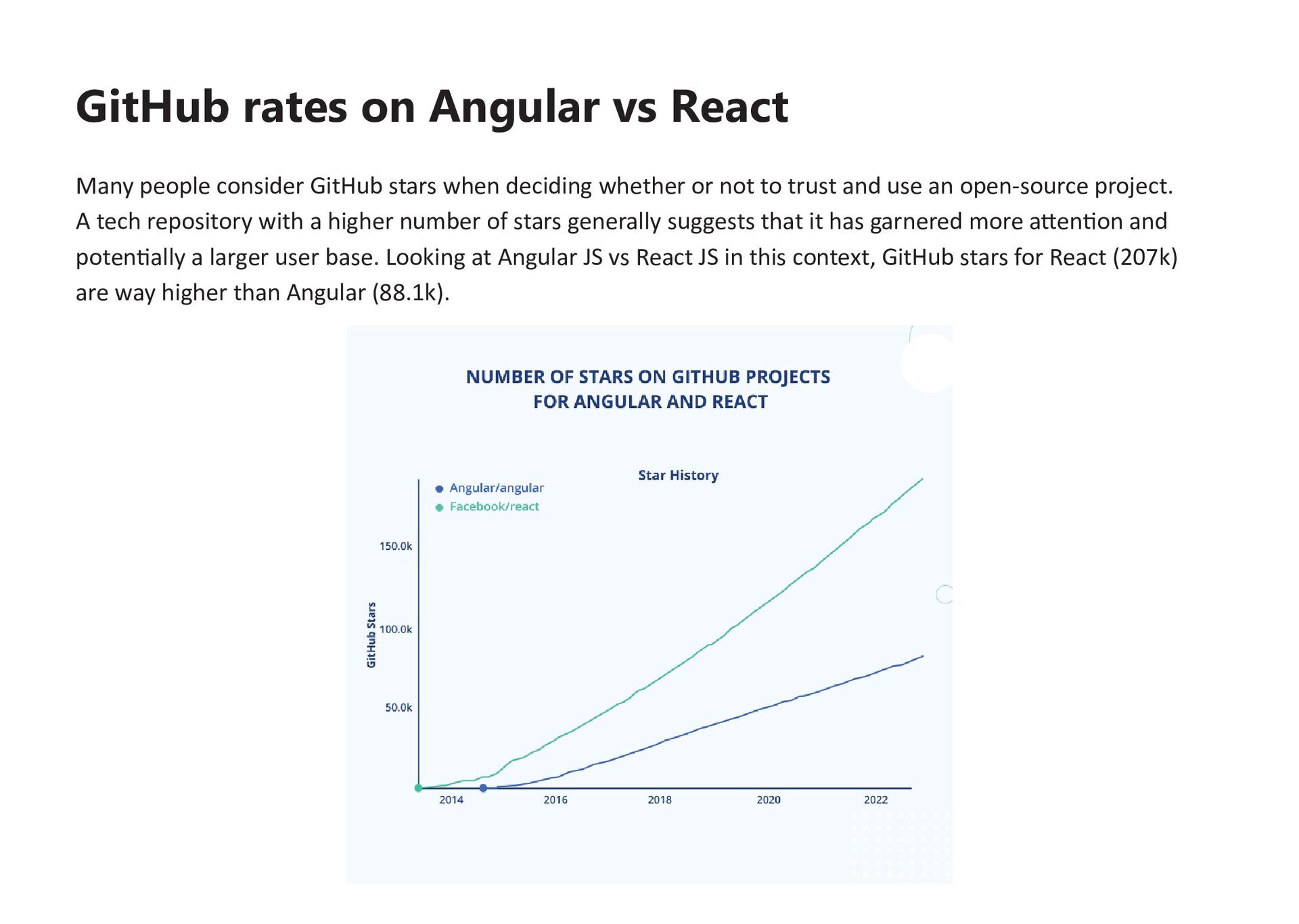 stars when deciding whether or not to trust and use an open-source project. A tech repository with a higher number of stars generally suggests that it has garnered more a�en�on and poten�ally a larger user base. Looking at Angular JS vs React JS in this context, GitHub stars for React (207k) are way higher than Angular (88.1k).