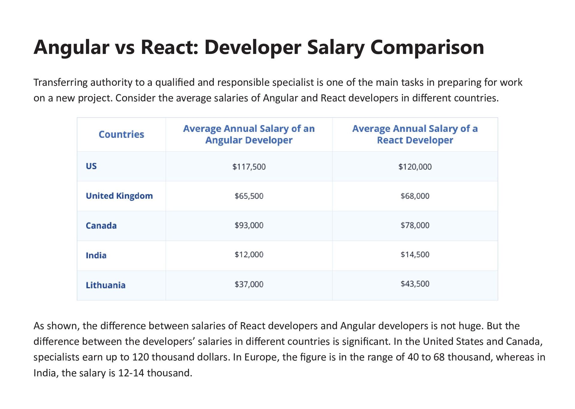 qualified and responsible specialist is one of the main tasks in preparing for work on a new project. Consider the average salaries of Angular and React developers in different countries. As shown, the difference between salaries of React developers and Angular developers is not huge. But the difference between the developers’ salaries in different countries is significant. In the United States and Canada, specialists earn up to 120 thousand dollars. In Europe, the figure is in the range of 40 to 68 thousand, whereas in India, the salary is 12-14 thousand.
