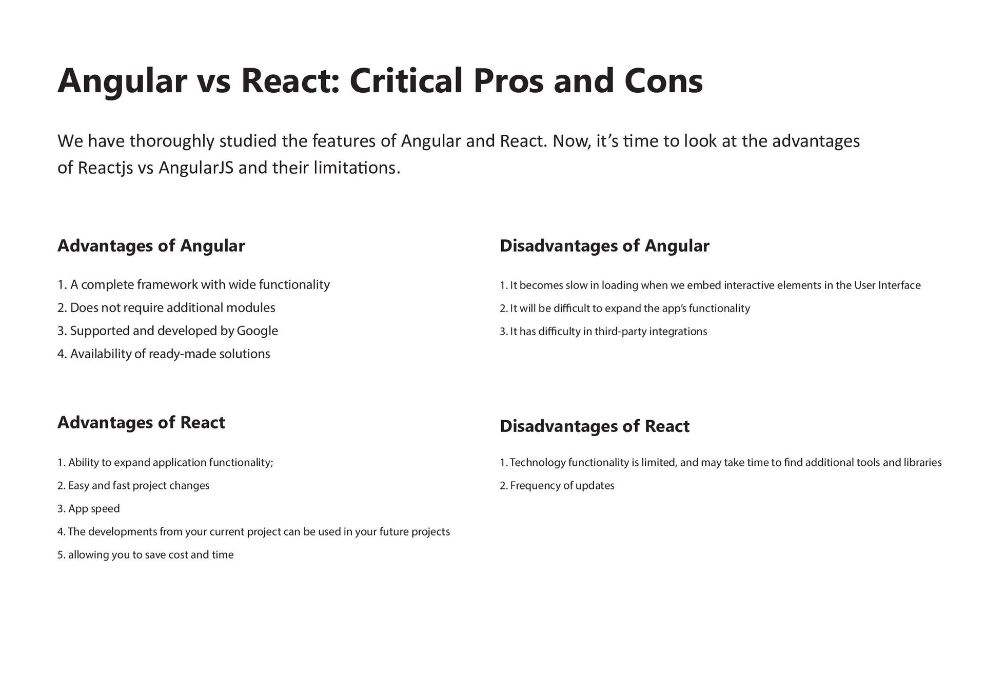 studied the features of Angular and React. Now, it’s �me to look at the advantages of Reactjs vs AngularJS and their limita�ons. Advantages of Angular Disadvantages of Angular 1. A complete framework with wide functionality 2. Does not require additional modules 3. Supported and developed by Google 4. Availability of ready-made solutions Disadvantages of React 1. It becomes slow in loading when we embed interactive elements in the User Interface 2. It will be di cult to expand the app’s functionality 3. It has di culty in third-party integrations Advantages of React 1. Ability to expand application functionality; 2. Easy and fast project changes 3. App speed 4. The developments from your current project can be used in your future projects 5. allowing you to save cost and time 1. Technology functionality is limited, and may take time to nd additional tools and libraries 2. Frequency of updates