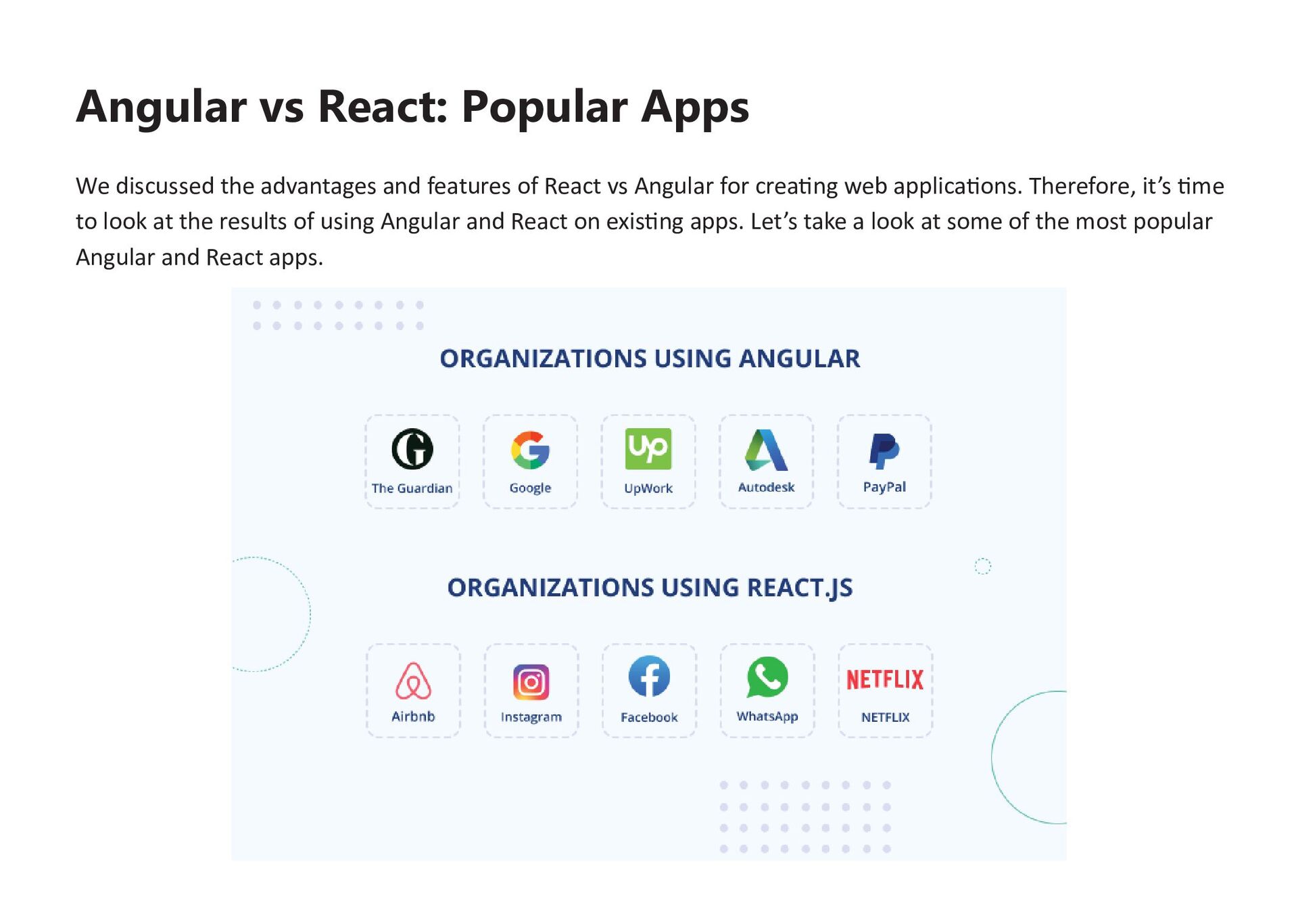features of React vs Angular for crea�ng web applica�ons. Therefore, it’s �me to look at the results of using Angular and React on exis�ng apps. Let’s take a look at some of the most popular Angular and React apps.