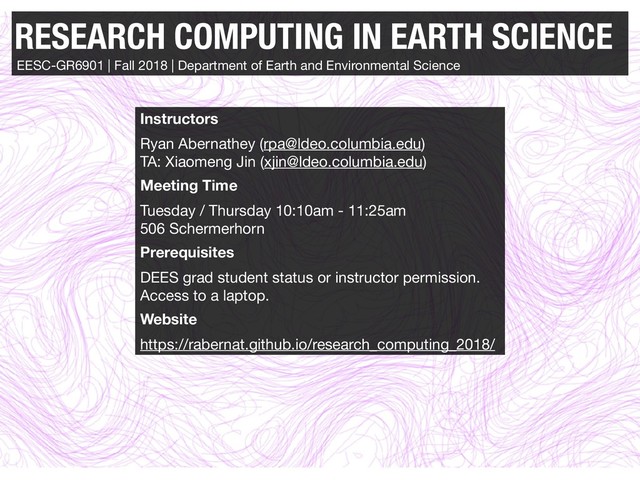 Department of Earth and Environmental Science Instructors Ryan Abernathey ([email protected]) TA: Xiaomeng Jin ([email protected]) Meeting Time Tuesday / Thursday 10:10am - 11:25am 506 Schermerhorn Prerequisites DEES grad student status or instructor permission. Access to a laptop. Website https://rabernat.github.io/research_computing_2018/