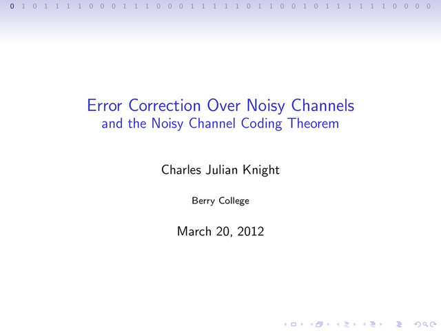 1 1 1 0 0 0 1 1 1 1 1 0 1 1 0 0 1 0 1 1 1 1 1 1 0 0 0 0 Sources Primary Sources 1. Aiden A. Bruen and Mario A. Forcintino. Cryptography, Information Theory, and Error-Correction John Wiley Sons, 2005. 2. David J. C. MacKay. Information Theory, Inference, and Learning Algorithms Cambridge University Press, 2003. Papers 1. Claude E. Shannon, Warren Weaver. The Mathematical Theory of Communication Univ of Illinois Press, 1949. 2. Thomas A. Kunkel. DNA Replication Fidelity JBC Papers 2004.