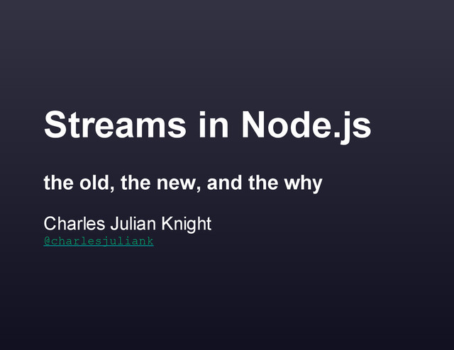 c k @ d o m i n i c t a r r @ t o o t a l l n a t e MarkdownPresenter slides & notes speakerdeck.com/rabidaudio/node-streams github.com/rabidaudio/stream-talk