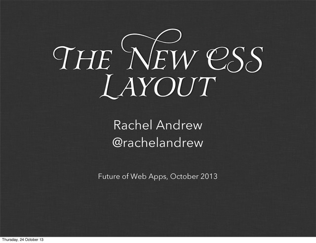 My Grid examples on CodePen - http://codepen.io/rachelandrew/tag/ 24%20ways CSS Grid Layout - what has changed? - http://www.rachelandrew.co.uk/ archives/2013/04/10/css-grid-layout---what-has-changed/ Named Lines and Grid areas - http://www.rachelandrew.co.uk/archives/ 2013/04/29/css-grid-layout-named-grid-lines-and-areas/ My Grid Resources Thursday, 24 October 13