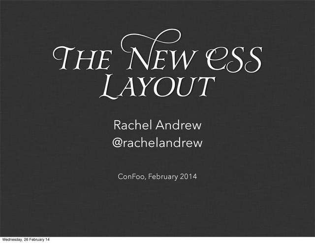 My Grid examples on CodePen - http://codepen.io/rachelandrew/tag/ 24%20ways CSS Grid Layout - what has changed? - http://www.rachelandrew.co.uk/ archives/2013/04/10/css-grid-layout---what-has-changed/ Named Lines and Grid areas - http://www.rachelandrew.co.uk/archives/ 2013/04/29/css-grid-layout-named-grid-lines-and-areas/ My Grid Resources Wednesday, 26 February 14