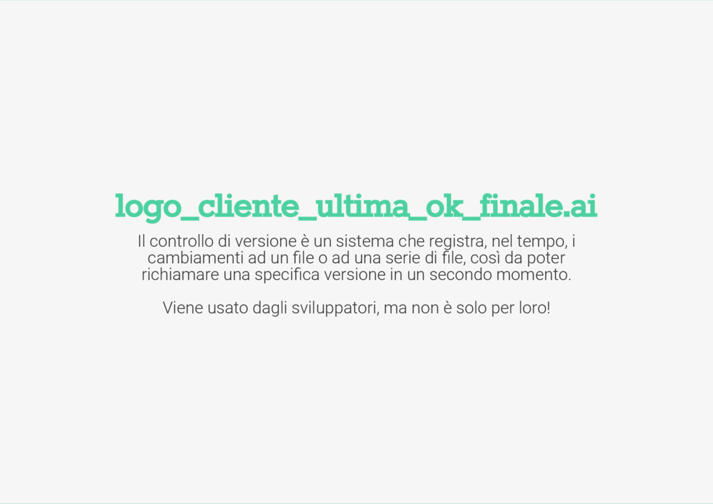 tempo, i cambiamenti ad un file o ad una serie di file, così da poter richiamare una specifica versione in un secondo momento. Viene usato dagli sviluppatori, ma non è solo per loro! logo_cliente_ultima_ok_finale.ai