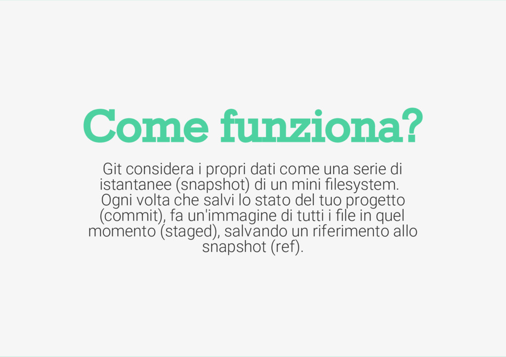 (snapshot) di un mini filesystem. Ogni volta che salvi lo stato del tuo progetto (commit), fa un'immagine di tutti i file in quel momento (staged), salvando un riferimento allo snapshot (ref). Come funziona?