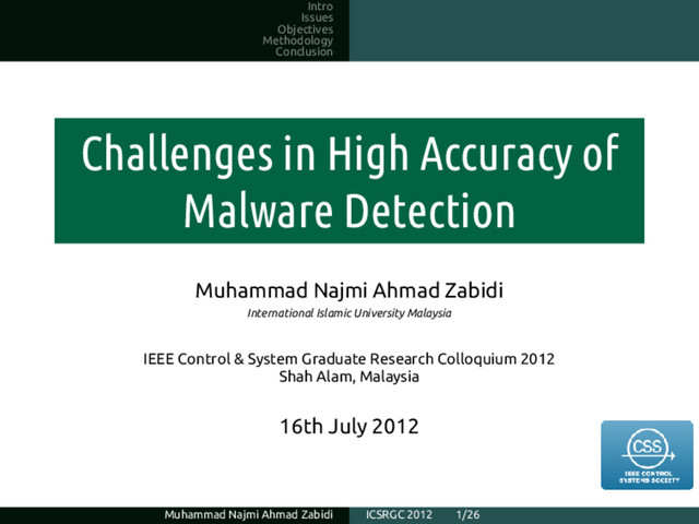 Malware Detection Muhammad Najmi Ahmad Zabidi International Islamic University Malaysia IEEE Control & System Graduate Research Colloquium 2012 Shah Alam, Malaysia 16th July 2012 Muhammad Najmi Ahmad Zabidi ICSRGC 2012 1/26