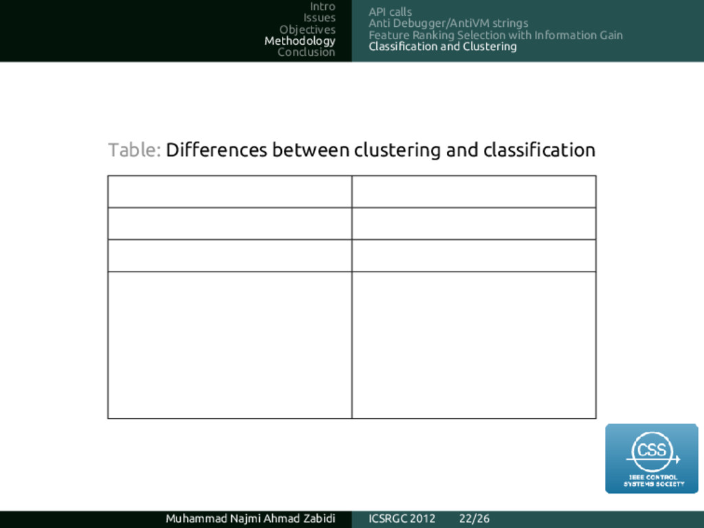 Feature Ranking Selection with Information Gain Classification and Clustering Table: Differences between clustering and classification Muhammad Najmi Ahmad Zabidi ICSRGC 2012 22/26