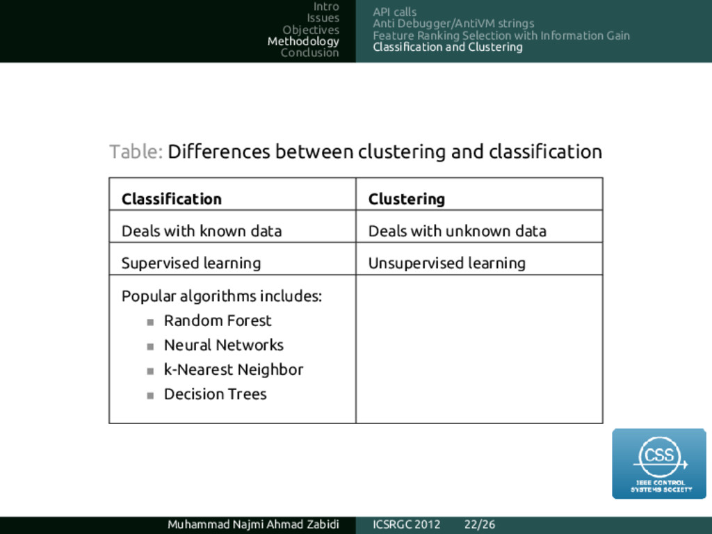 Feature Ranking Selection with Information Gain Classification and Clustering For research purpose the following issues are always wondered: No standard dataset, unlike Intrusion Detection System (IDS) area Fast-paced malware sample, will the datasets being used for the experiment will be questioned Last resort, stick to the existing database, try to free from any specific malware family as to make sure the method will/could work with incoming, new malware Muhammad Najmi Ahmad Zabidi ICSRGC 2012 21/26