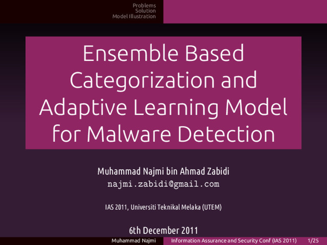Model for Malware Detection Muhammad Najmi bin Ahmad Zabidi [email protected] IAS 2011, Universiti Teknikal Melaka (UTEM) 6th December 2011 Muhammad Najmi Information Assurance and Security Conf (IAS 2011) 1/25