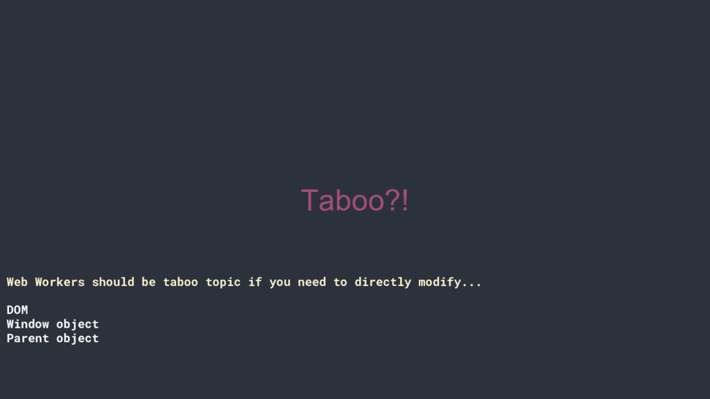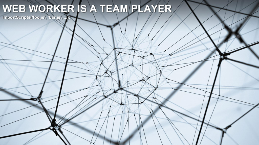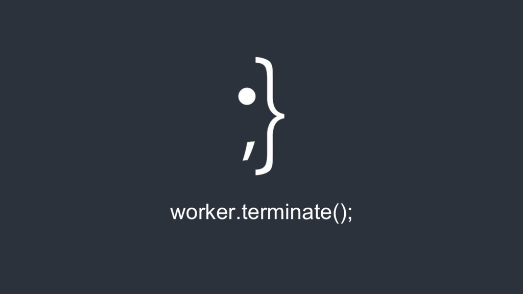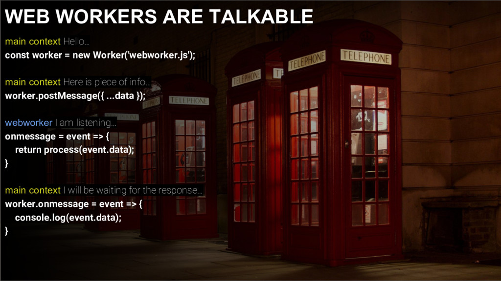 = new Worker('webworker.js'); main context Here is piece of info… worker.postMessage({ ...data }); webworker I am listening… onmessage = event => { return process(event.data); } main context I will be waiting for the response… worker.onmessage = event => { console.log(event.data); }
