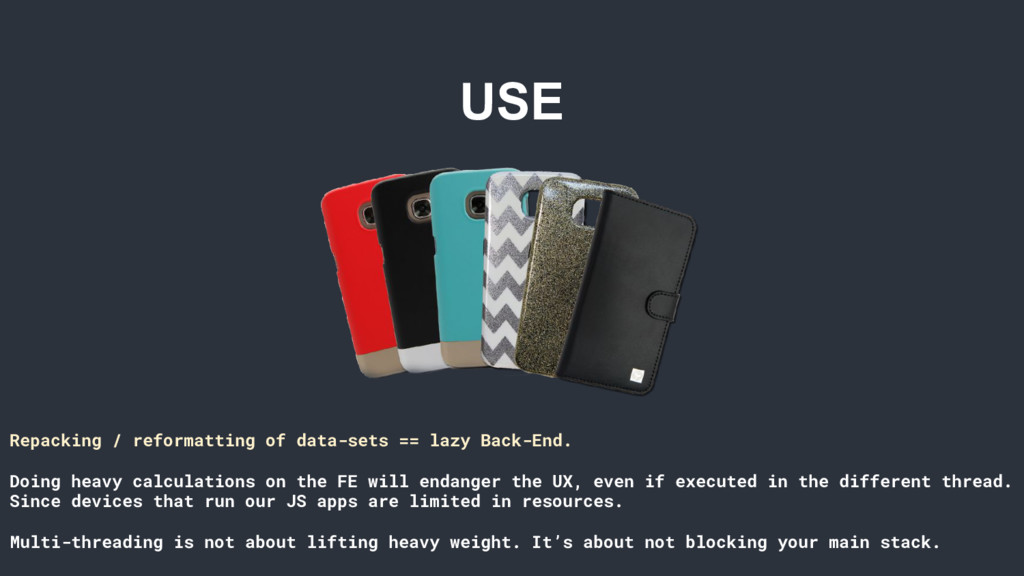heavy calculations on the FE will endanger the UX, even if executed in the different thread. Since devices that run our JS apps are limited in resources. Multi-threading is not about lifting heavy weight. It’s about not blocking your main stack.