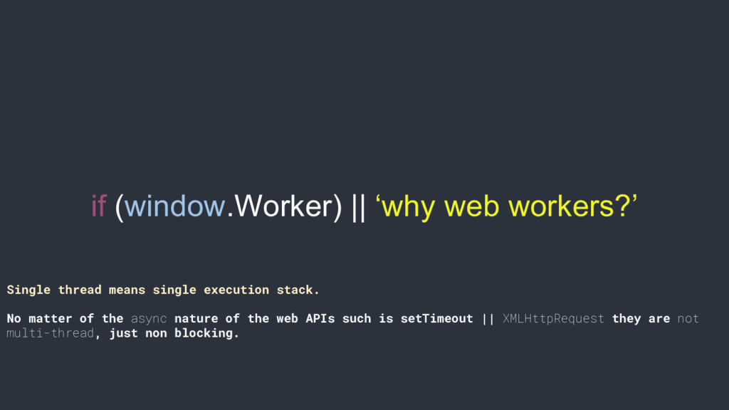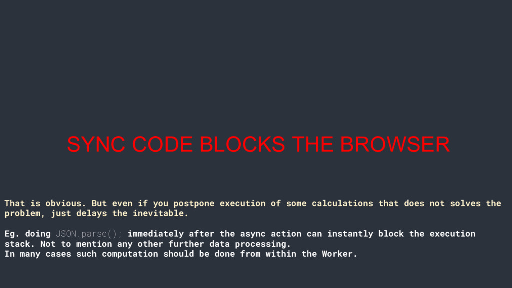 if you postpone execution of some calculations that does not solves the problem, just delays the inevitable. Eg. doing JSON.parse(); immediately after the async action can instantly block the execution stack. Not to mention any other further data processing. In many cases such computation should be done from within the Worker.
