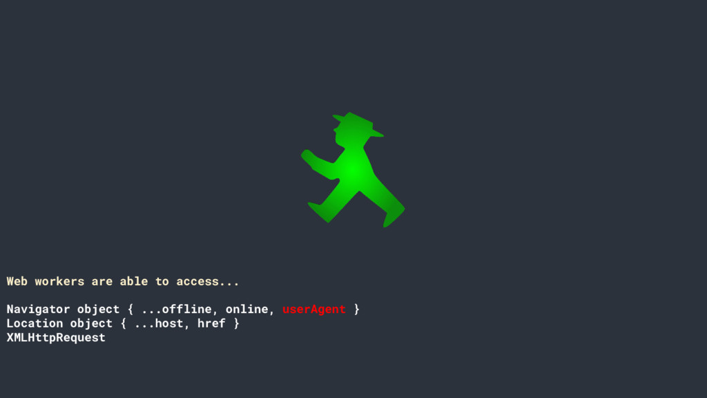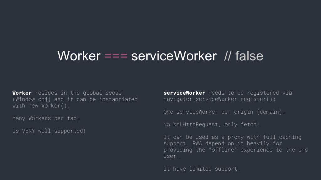 scope (Window obj) and it can be instantiated with new Worker(); Many Workers per tab. Is VERY well supported! serviceWorker needs to be registered via navigator.serviceWorker.register(); One serviceWorker per origin (domain). No XMLHttpRequest, only fetch! It can be used as a proxy with full caching support. PWA depend on it heavily for providing the “offline” experience to the end user. It have limited support.