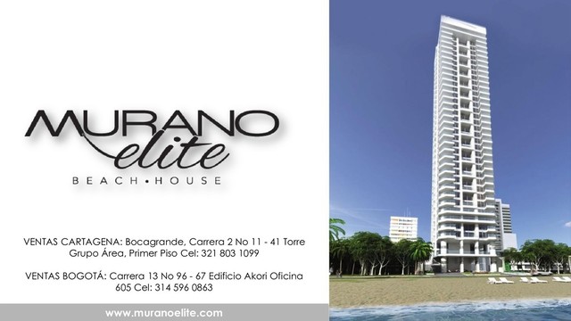 En el exclusivo sector de Bocagrande, frente a la playa y tan sólo a 3 minutos del Centro Historico de Cartagena de Indias. El proyecto Murano Elite contara con 36 pisos de altura y apartamentos de 62Mts2, 70Mts2, 95Mts2, y 117Mts2, desde 1 alcoba hasta 3 alcobas. Tendra 2 pisos diseñados especialmente para areas sociales y amenidades, tales como, dos piscinas, jacuzzi, spa dotado, gimnasio, sport bar-billar, entre otras amenidades.