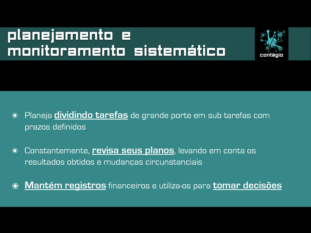 porte em sub tarefas com prazos definidos ๏ Constantemente, revisa seus planos, levando em conta os resultados obtidos e mudanças circunstanciais ๏ Mantém registros financeiros e utiliza-os para tomar decisões