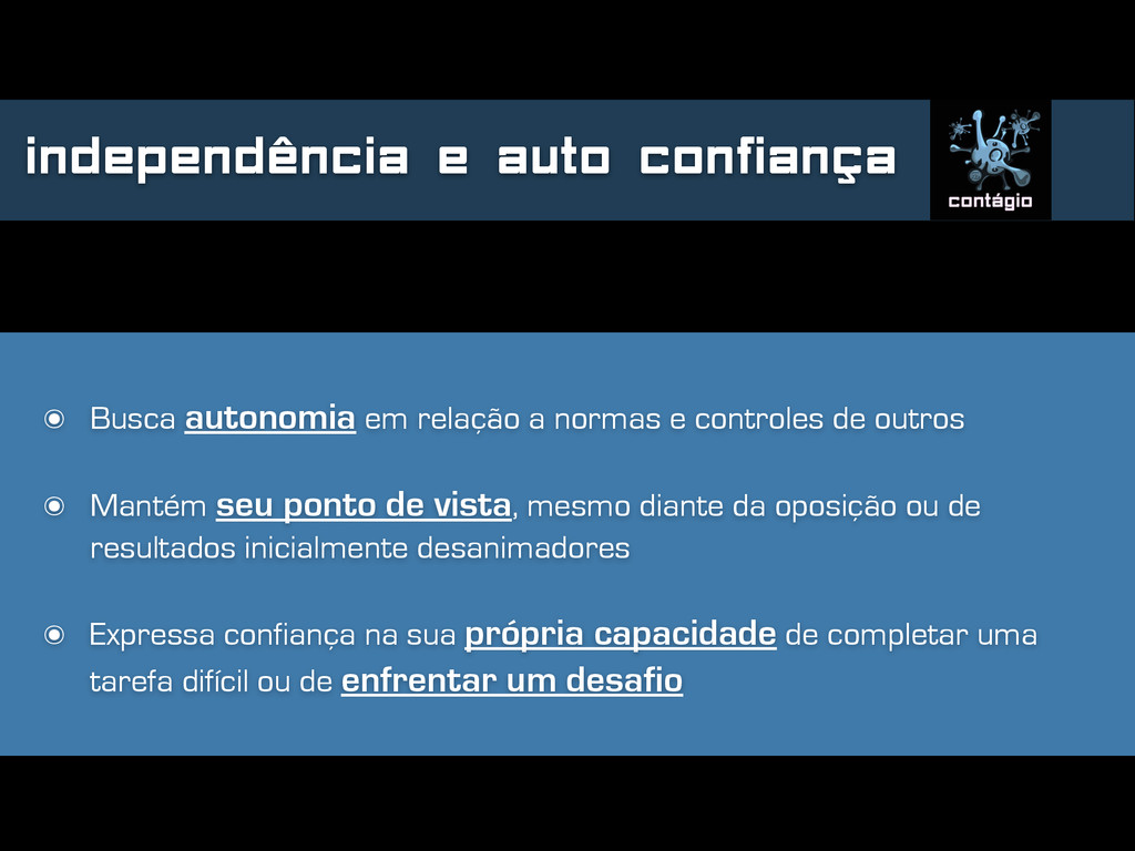 normas e controles de outros ๏ Mantém seu ponto de vista, mesmo diante da oposição ou de resultados inicialmente desanimadores ๏ Expressa confiança na sua própria capacidade de completar uma tarefa difícil ou de enfrentar um desafio