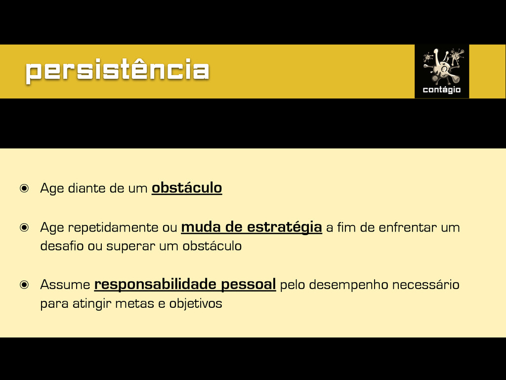 ou muda de estratégia a fim de enfrentar um desafio ou superar um obstáculo ๏ Assume responsabilidade pessoal pelo desempenho necessário para atingir metas e objetivos