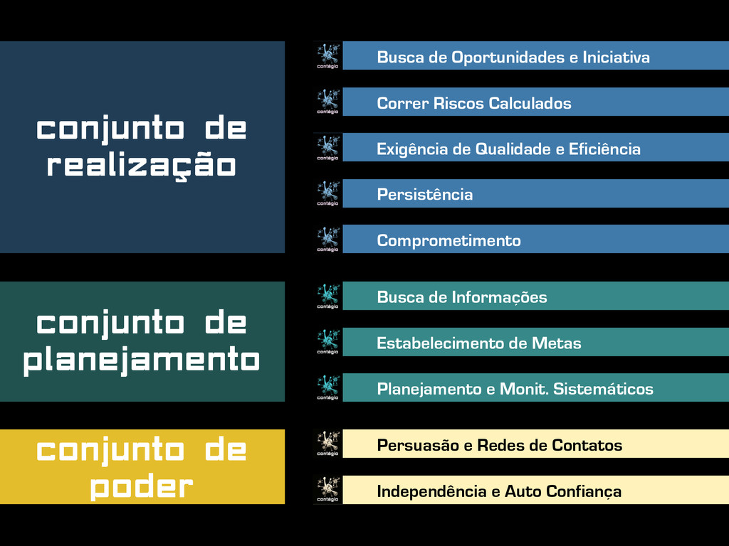 de Oportunidades e Iniciativa Correr Riscos Calculados Exigência de Qualidade e Eficiência Persistência Comprometimento Busca de Informações Estabelecimento de Metas Planejamento e Monit. Sistemáticos Persuasão e Redes de Contatos Independência e Auto Confiança