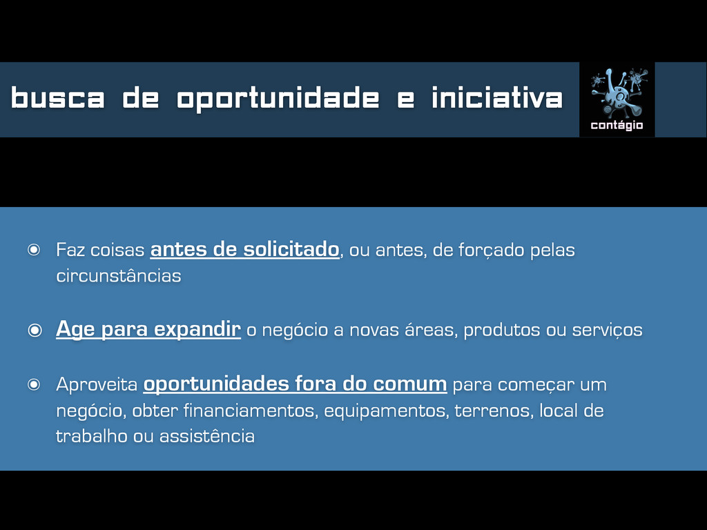 solicitado, ou antes, de forçado pelas circunstâncias ๏ Age para expandir o negócio a novas áreas, produtos ou serviços ๏ Aproveita oportunidades fora do comum para começar um negócio, obter financiamentos, equipamentos, terrenos, local de trabalho ou assistência