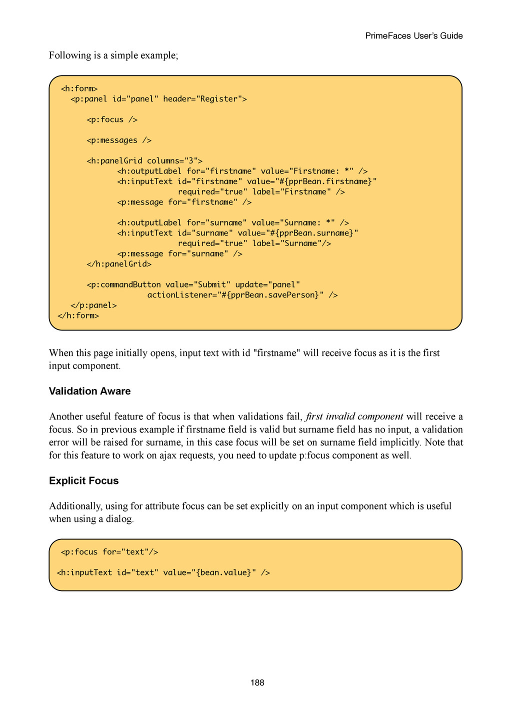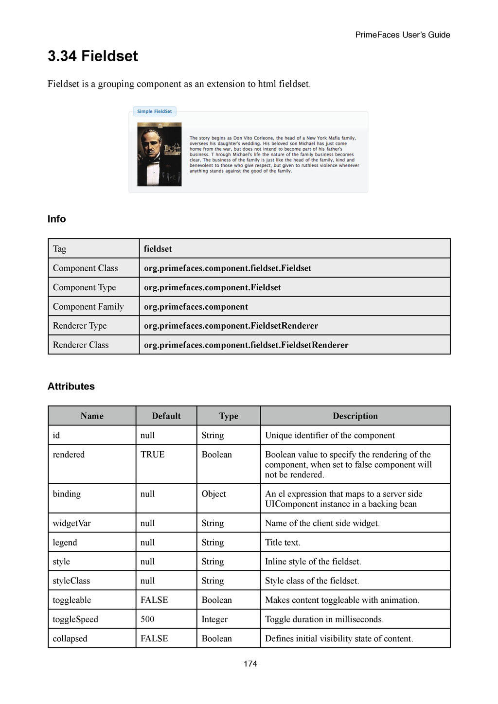extension so for instance mov files will be played by quicktime player. You can customize which player to use with the player attribute. <p:media value="http://www.youtube.com/v/ABCDEFGH" player="flash"/> Following is the supported players and file types. Player Types windows asx, asf, avi, wma, wmv quicktime aif, aiff, aac, au, bmp, gsm, mov, mid, midi, mpg, mpeg, mp4, m4a, psd, qt, qtif, qif, qti, snd, tif, tiff, wav, 3g2, 3pg flash flv, mp3, swf real ra, ram, rm, rpm, rv, smi, smil pdf pdf Parameters Different proprietary players might have different configuration parameters, these can be specified using f:param tags. <p:media value="/media/ria_with_primefaces.mov"> <f:param name="param1" value="value1" /> </p:media> StreamedContent Support Media component can also play binary media content, example for this use case is storing media files in database using binary format. In order to implement this, bind a StreamedContent. <p:media value="#{mediaBean.media}" width="250" height="225" player="quicktime"/> public class MediaBean { private StreamedContent media; public MediaController() { InputStream stream = //Create binary stream from database media = new DefaultStreamedContent(stream, "video/quicktime"); } public StreamedContent getMedia() { return media; } } PrimeFaces Userʼs Guide 261