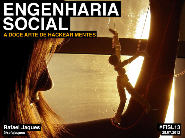 A Engenharia Social é a hábil manipulação da tendência humana de confiar. Essa palestra visa apresentar, tanto para usuários quanto para profissionais de TI, riscos que estamos correndo na internet e no mundo corporativo nos últimos tempos. A ingenuidade ou despreparo das pessoas pode causar prejuízos enormes. Engenheiros sociais estão aparecendo em grande número e provocando danos significativos. Venha comigo em um passeio para descobrir como e porque essas pessoas agem!