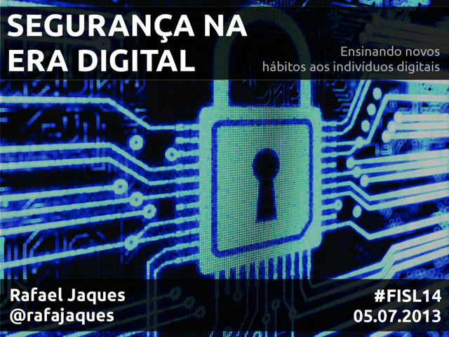 A evolução rápida da Internet criou uma nova cultura na sociedade. Porém nem todos acompanharam e assimilaram os hábitos necessários para manter sua privacidade e segurança no mundo digital. Essa palestra fala sobre hackers, crimes cibernéticos, fraudes, privacidade, censura e direito na web. Vamos aprender como melhorar nossos hábitos e ficar mais protegidos na era digital.