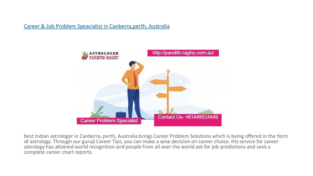 astrologer in Canberra, perth, Australia brings Career Problem Solutions which is being offered in the form of astrology. Through our guruji Career Tips, you can make a wise decision on career choice. His service for career astrology has attained world recognition and people from all over the world ask for job predictions and seek a complete career chart reports.
