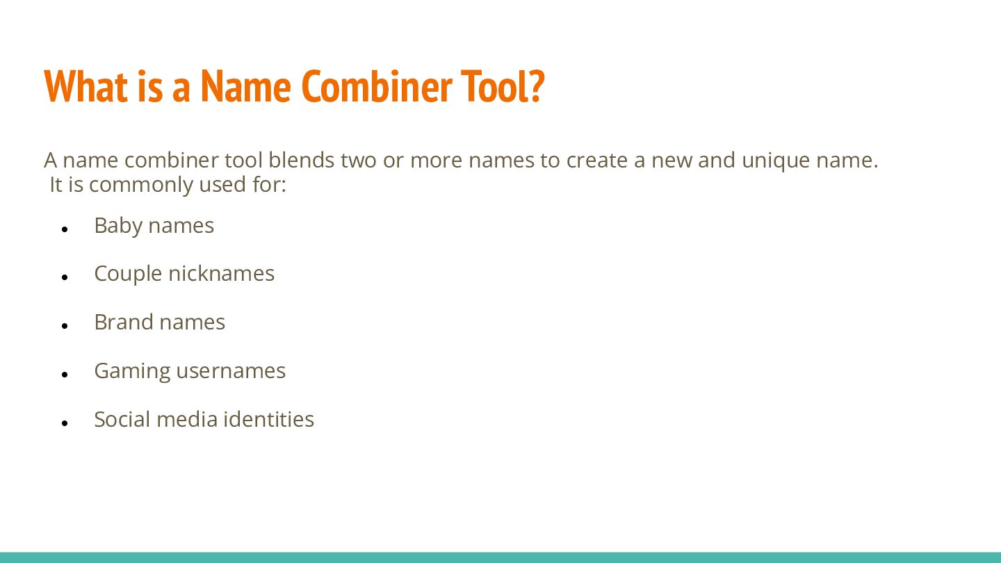 blends two or more names to create a new and unique name. It is commonly used for: • Baby names • Couple nicknames • Brand names • Gaming usernames • Social media identities