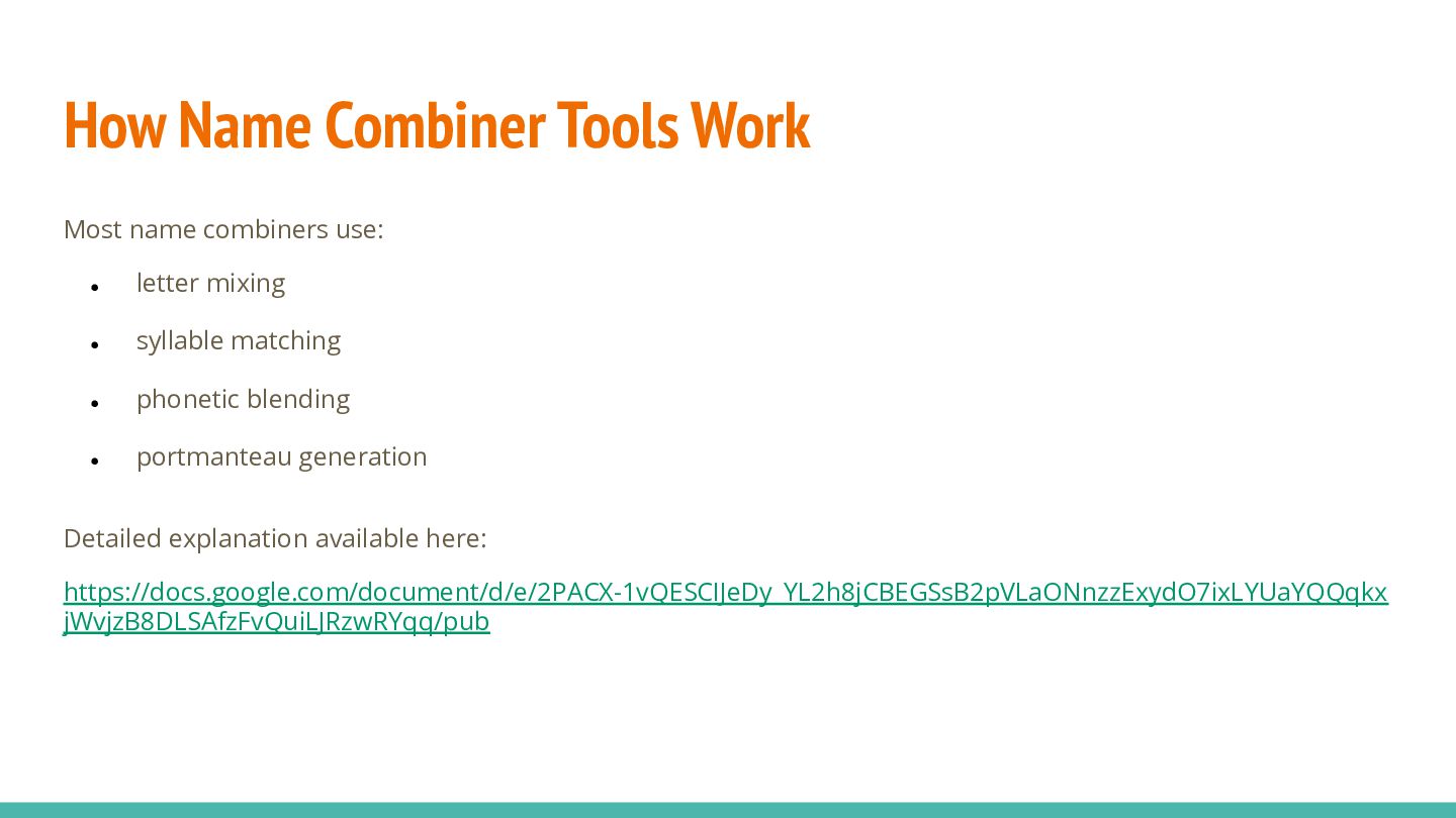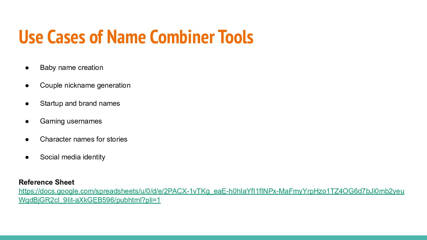 • Couple nickname generation • Startup and brand names • Gaming usernames • Character names for stories • Social media identity Reference Sheet https://docs.google.com/spreadsheets/u/0/d/e/2PACX-1vTKg_eaE-h0hIaYfI1fINPx-MaFmyYrpHzo1TZ4OG6d7bJi0mb2yeu WqdBjGR2cl_9Iit-aXkGEB596/pubhtml?pli=1