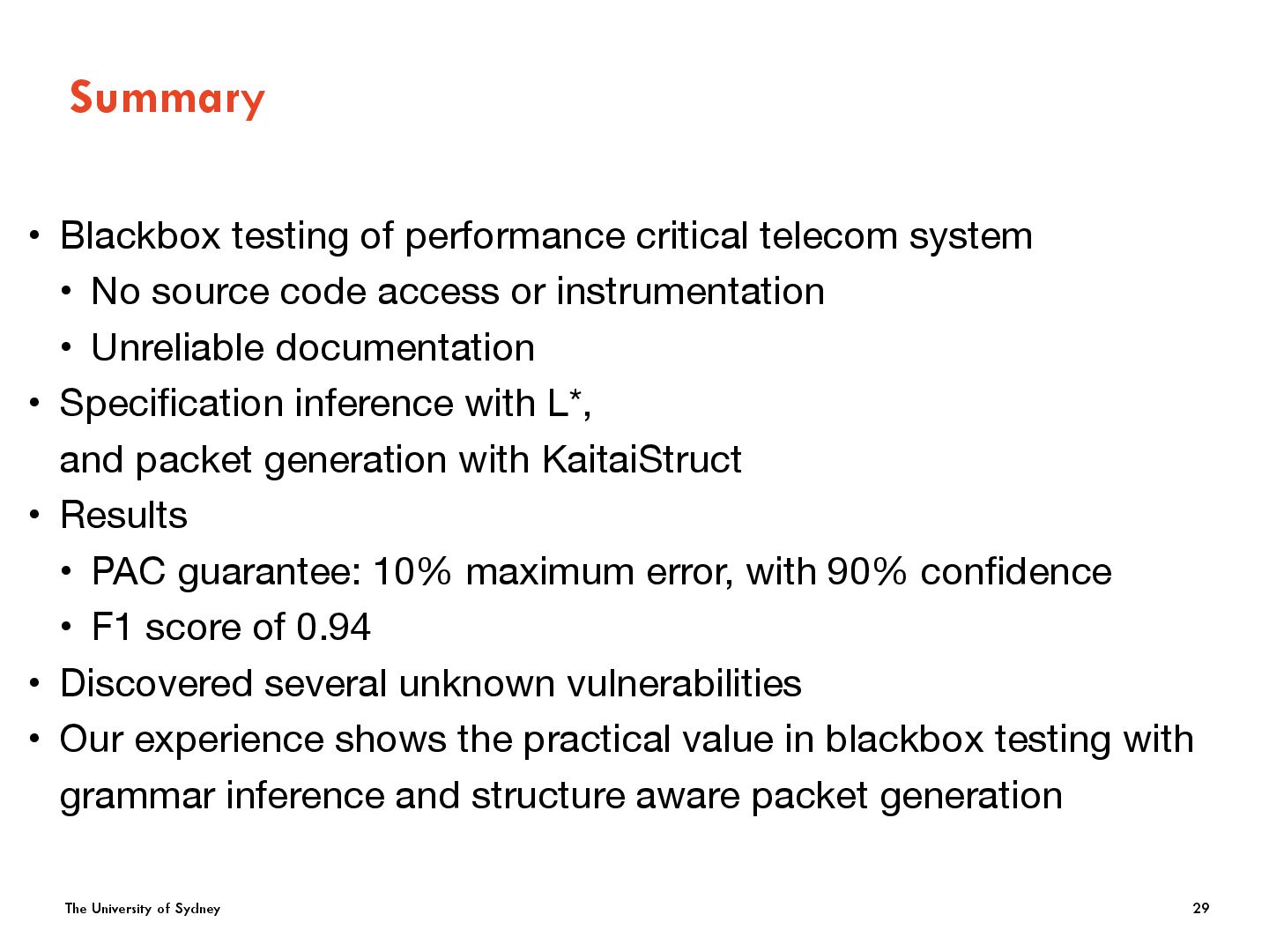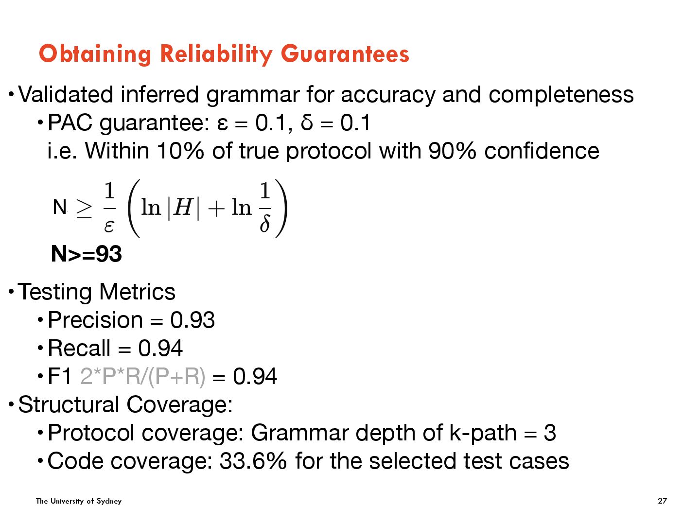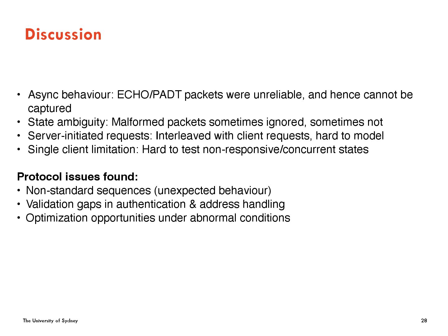 packets were unreliable, and hence cannot be captured • State ambiguity: Malformed packets sometimes ignored, sometimes not • Server-initiated requests: Interleaved with client requests, hard to model • Single client limitation: Hard to test non-responsive/concurrent states Protocol issues found: • Non-standard sequences (unexpected behaviour) • Validation gaps in authentication & address handling • Optimization opportunities under abnormal conditions