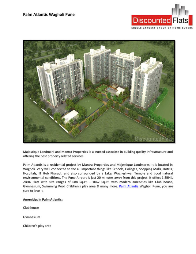 a trusted associate in building quality infrastructure and offering the best property related services. Palm Atlantis is a residential project by Mantra Properties and Majestique Landmarks. It is located in Wagholi. Very well connected to the all important things like Schools, Colleges, Shopping Malls, Hotels, Hospitals, IT Hub Kharadi, and also surrounded by a Lake, Wagheshwar Temple and good natural environmental conditions. The Pune Airport is just 20 minutes away from this project. It offers 1.5BHK, 2BHK Flats with size ranges of 688 Sq.Ft. - 1062 Sq.Ft. with modern amenities like Club house, Gymnasium, Swimming Pool, Children’s play area & many more. Palm Atlantis Wagholi Pune, you are sure to love it. Amenities in Palm Atlantis: Club house Gymnasium Children’s play area