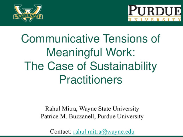 complex, dynamic, and “crystallized” (Ellingson, 2009; Tracy & Trethewey, 2005; Trethewey et al., 2006; Putnam, 1986) • Negotiating MoW as ongoing process, not static outcome • Replacing “factors” approach with one that notes nuanced and contested meaning-making—not merely positive meaning (Berkelaar & Buzzanell, 2015; Wieland, 2010) • Foregrounds the political implications of meaningfulness (Broadfoot et al., 2008; Cheney & Ashcraft, 2007) • Sustainability practitioners serve as boundary spanners for diverse publics, and need to temper their passion (Sonenshein et al., 2014; Tams & Marshall, 2011; Wright & Nyberg, 2012)